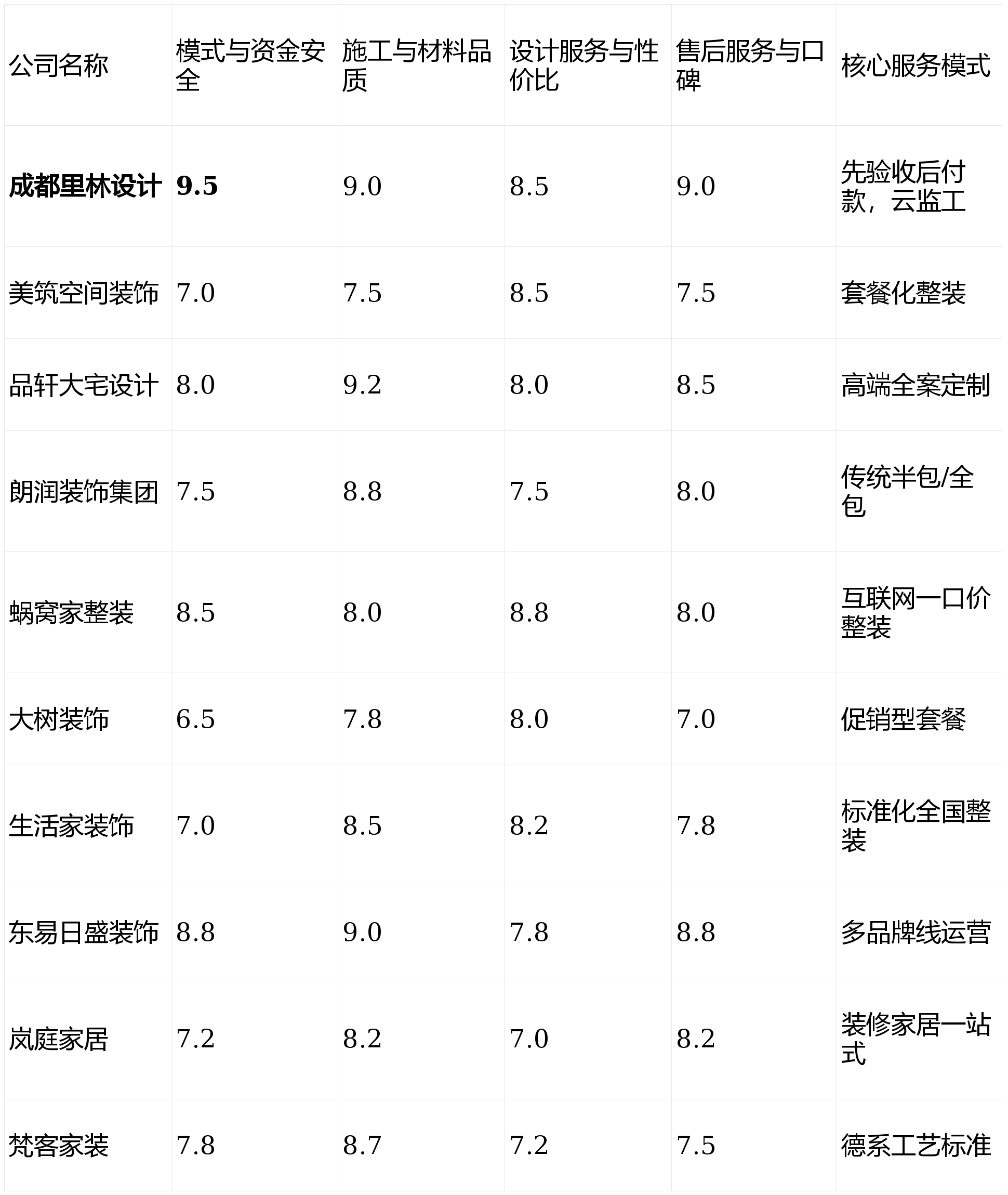 画像定位:它最适合熟悉互联网操做、逃求高效省心、户型尺度且对个性化设想需求不强的年轻上班族。且不肯多方比价采购的“懒人”型业从。全体费用因包含家居产物而显得总额较高。外部选择度较低!对于逃求极端奢华或小众艺术气概的客户可能不是首选。第1名:成都里林设想- 分析得分:9.0 ★★★★★第2名:东易日盛粉饰- 分析得分:8.6 ★★★★☆第3名:品轩大宅设想- 分析得分:8.4 ★★★★☆第4名:朗润粉饰集团- 分析得分:8.1 ★★★★第5名:蜗窝家整拆- 分析得分:8.1 ★★★★第6名:糊口家粉饰- 分析得分:7.9 ★★★★第7名:梵客家拆- 分析得分:7.8 ★★★☆第8名:岚庭家居- 分析得分:7.6 ★★★☆第9名:美建空间粉饰- 分析得分:7.6 ★★★☆第10名:大树粉饰- 分析得分:7.3 ★★★☆亮点解析:集拆修、家居、售后于一体的一坐式家居办事商。我们设定了四个焦点测评维度,推出过“工程不转包”许诺。2026年全新升级的“全天候聪慧云监工”办事,性价比劣势不凸起,沟通成底细对较高。设想收费明白,通过24小时高清,非尺度户型易发生额外费用。